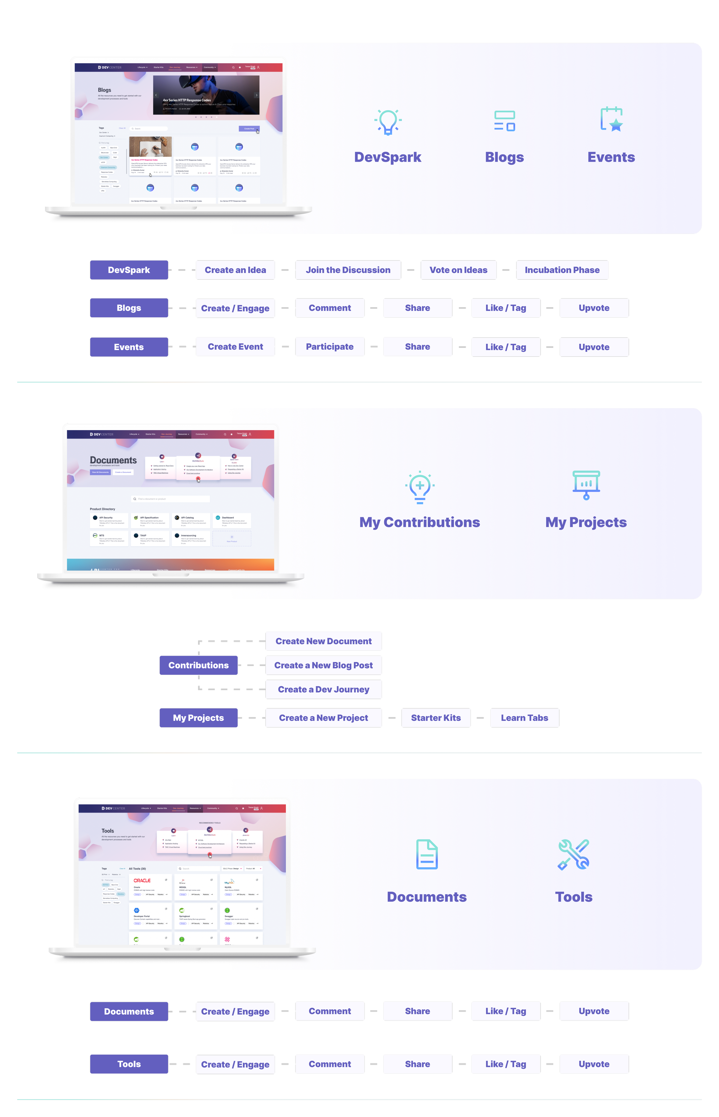 The features are primarily implemented on the Homepage, the Starter Kits, and the Community pages.
